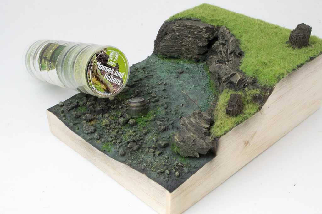 Rybník je často plný zeleně na dnu. Pro tento efekt jsem využil naprosto parádní produkty Landscapes. Na místa, kde jsem efekt chtěl, jsem nanesl lepidlo a jemně posypal požadovaným odstínem. Zelěň jsem nanesl i na přechod skály se dnem.